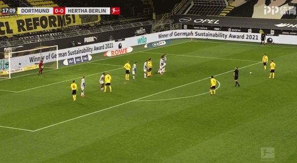 18'多特前场任意球机会,罗伊斯主罚电梯球击中横梁弹出!